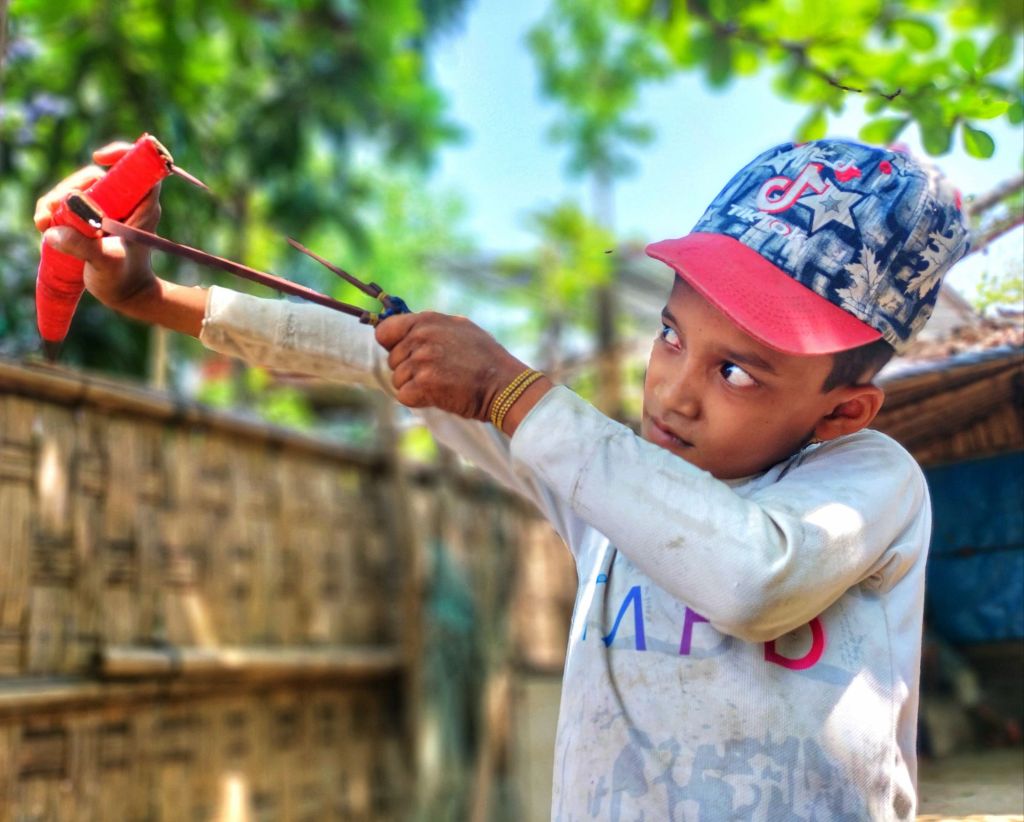 Abu Kalam, a twelve-year-old boy, is the son of Abu Siddek and a student of Life Destination High School, living in Kutupalong Refugee Camp in Bangladesh. Even in a place where animals and birds are now rare, Kalam finds happiness holding a simple slingshot in his hand, pretending to shoot at birds as children once did back home.